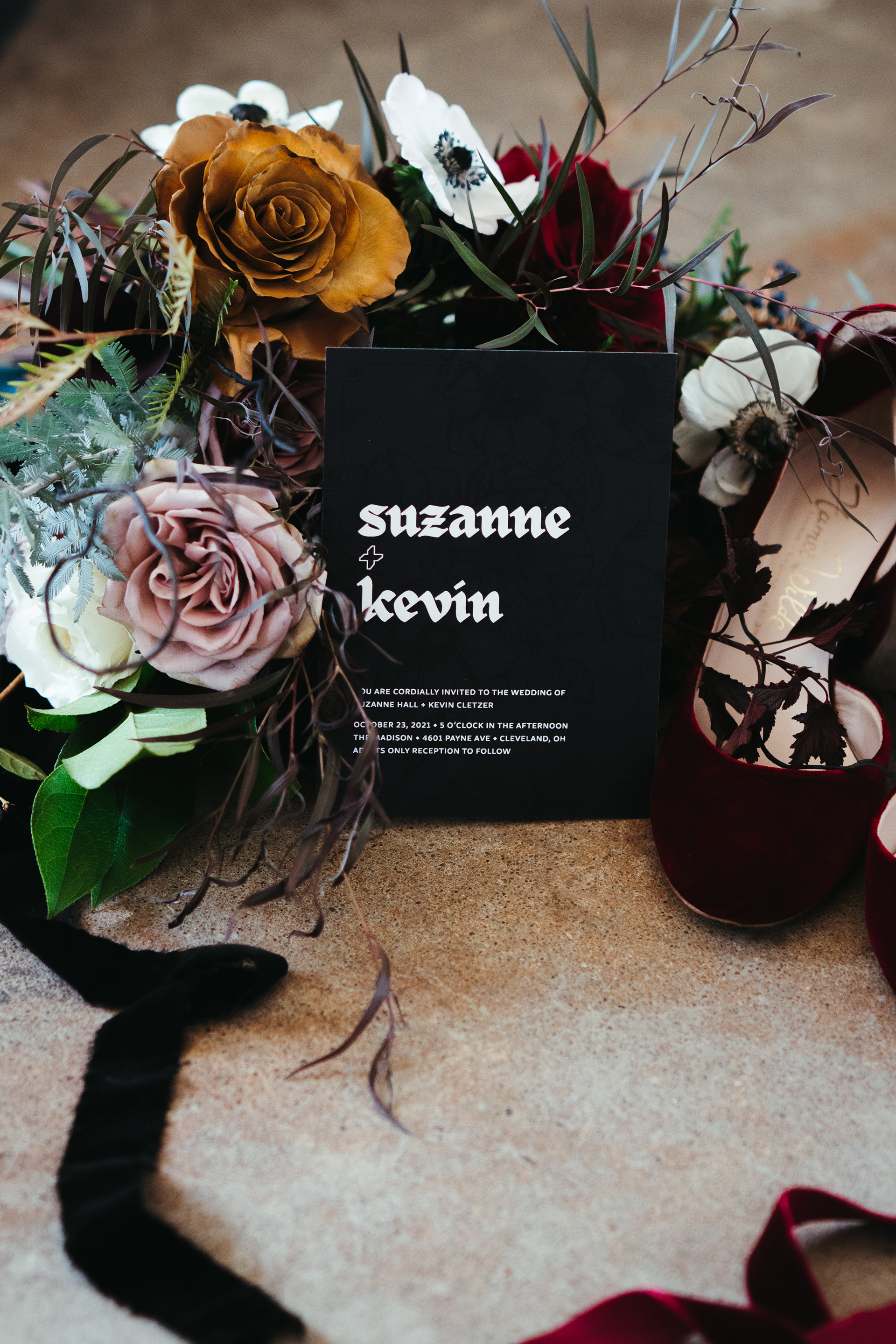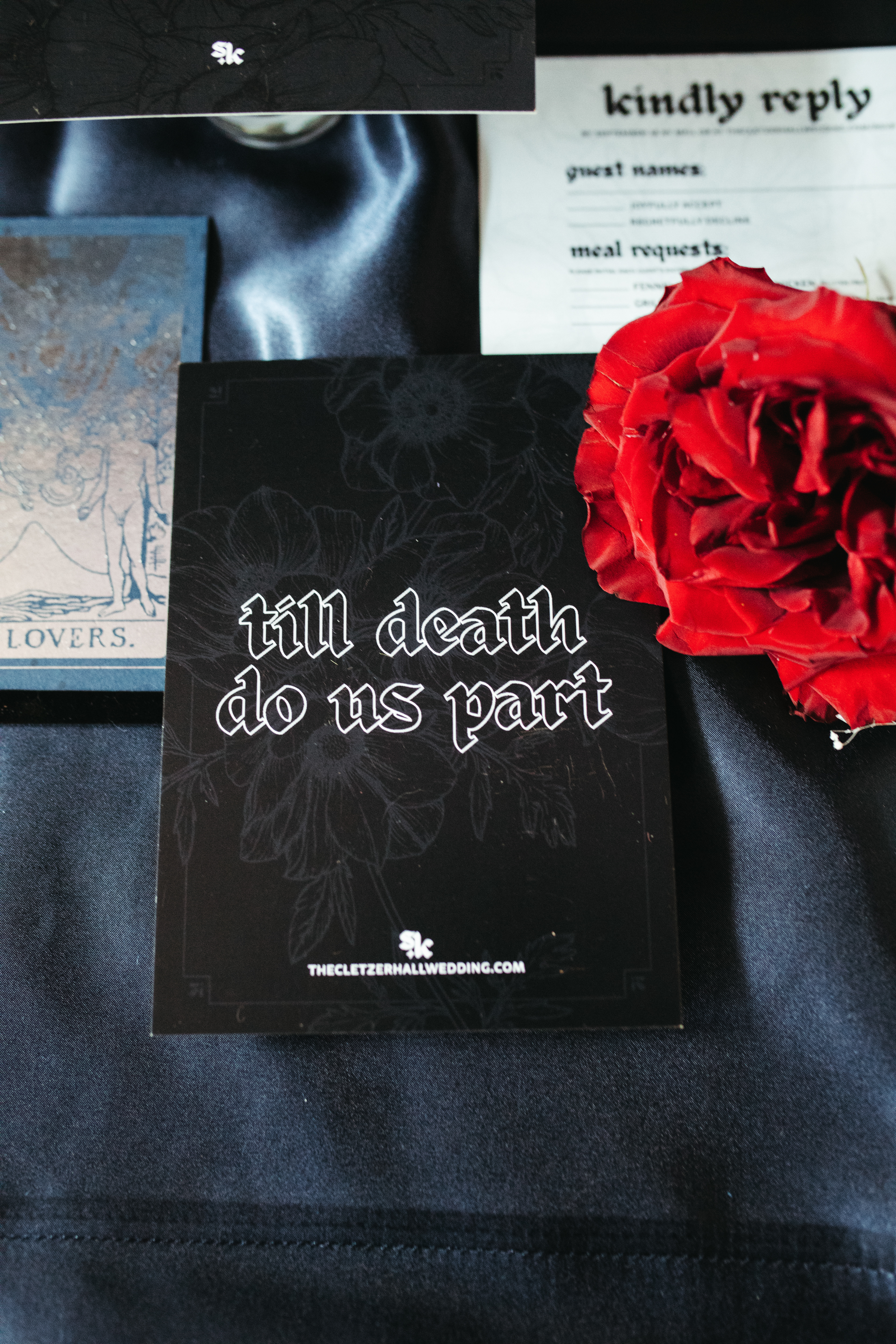 On October 23, 2021, Suzanne Hall and I took our first steps into married life. As a designer, I could not pass up the chance to design my own wedding, no matter how stressful. Together, my wife and I landed on the theme "Till Death", choosing a dark color palette and spooky-chic aesthetic.